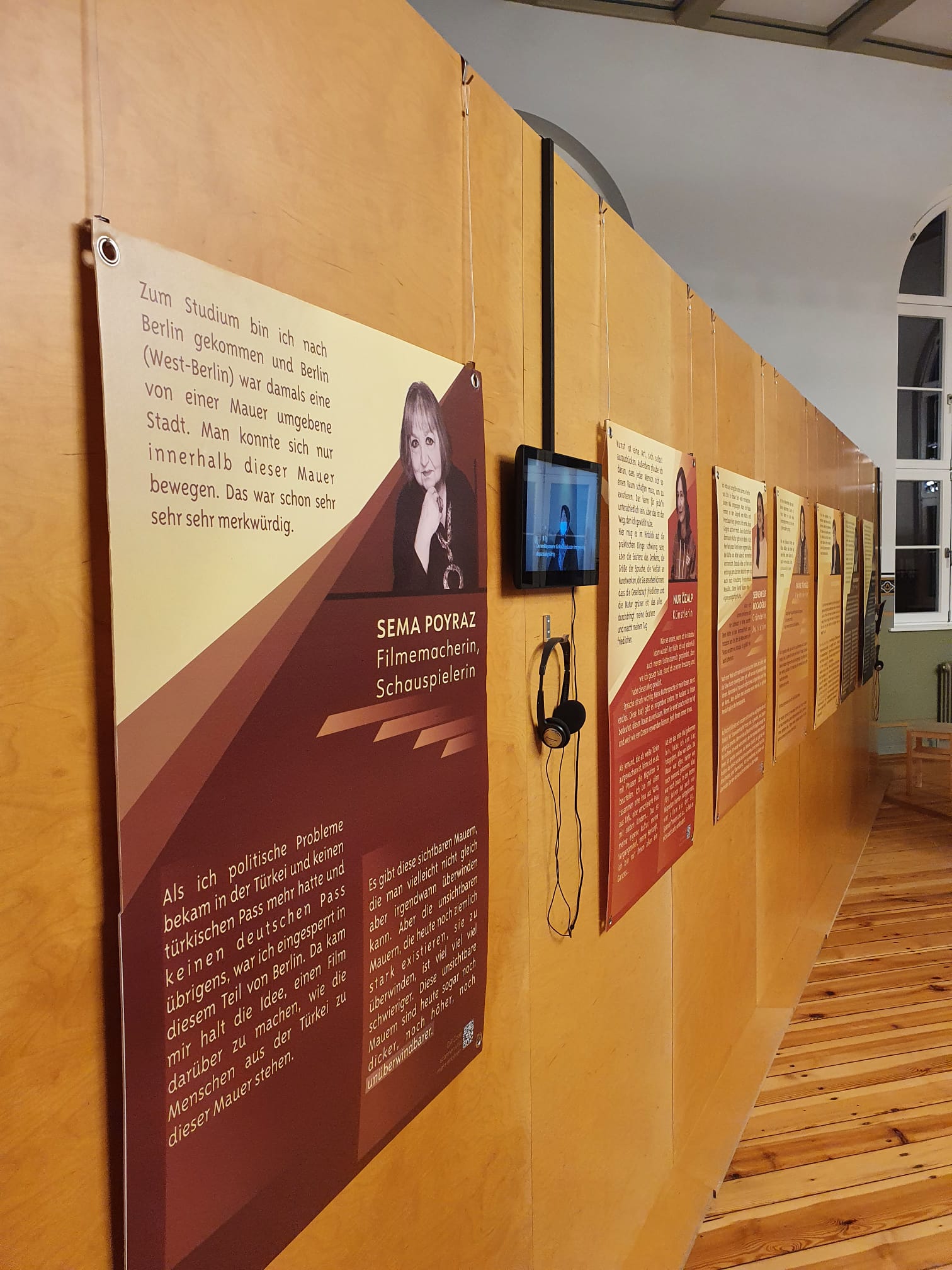 Auf einer Freifläche von BERLIN GLOBAL schauen sieben türkische Berlinerinnen auf ihre eigene Migrationserfahrung. Die Ankunft in Berlin verlangt eine Neuverhandlung ihrer transkulturellen Identität – für manche eine Befreiung, für andere ein Verlust. Die Installation lädt Besucher*innen ein über die eigene Position nachzudenken.
